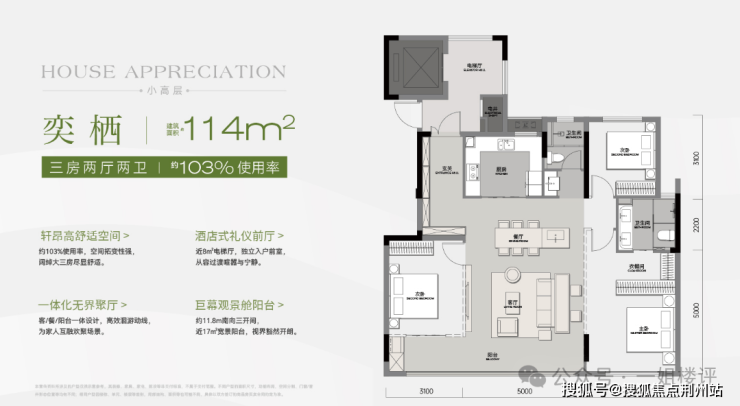 建面约114平三房两厅两卫是2号楼小高层中的户型,优化后约103%的使用率。