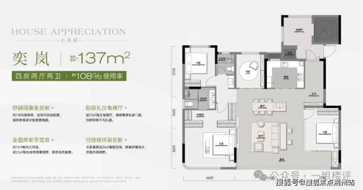 建面约137平四房两厅两卫,优化后约108%使用率: