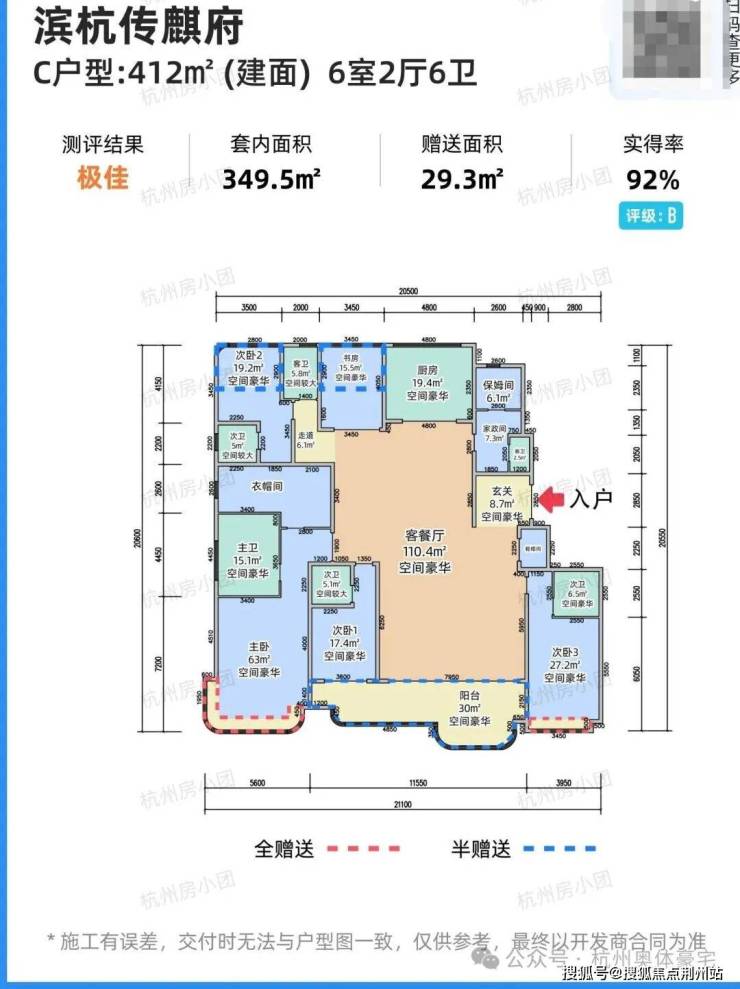- 416㎡(7房6卫):面宽超20米、双套房,但2个暗卫、过道面积浪费