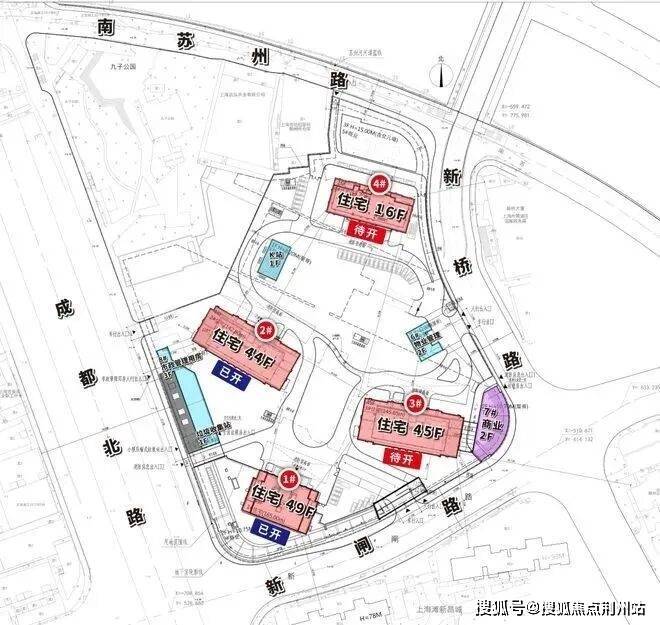 165米的高度不仅象征物理空间的突破,更寓意城市发展从“横向扩张”转向“立体深耕”。总体设计因地制宜“一叶四星”进行布局,充分发挥三边沿街,一边临河的环境优势,将最高的1号楼(49层)的建筑布置在成都北路与新闸路转角处,次高的2号楼、3号楼(44层、45层)分列成都北路、新闸路两侧,4号楼(16层)布置在基地北侧,形成了一个高低兼顾,启承有序,开阖有度的整体布局。