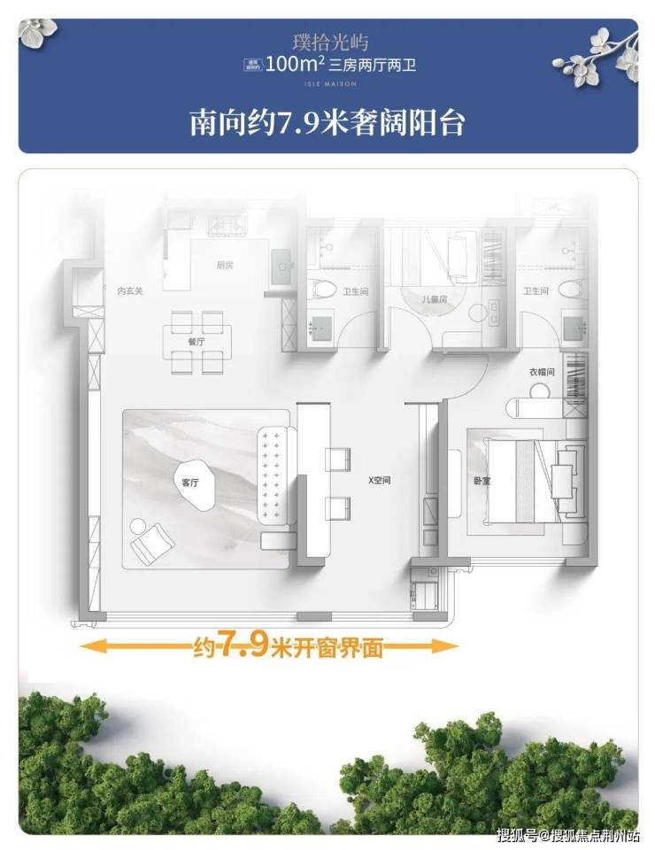 约7.9米奢阔尺度的阳台,连接客厅与X空间,将采光与自然景致最大化引入室内,这里既可设置晾晒区,高效解决日常家务需求,也能轻松打造健身区或亲子活动角,真正成为家庭中集休闲、实用、美观于一体的“第二客厅”。