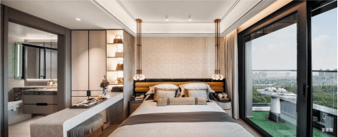 高标酒店风的主卧套房设计,配备衣帽间、卫浴间等主人房功能,同时配备情景式飘窗,映入《东山秋月》的自然诗意,让每一天的休憩都充满了仪式感。