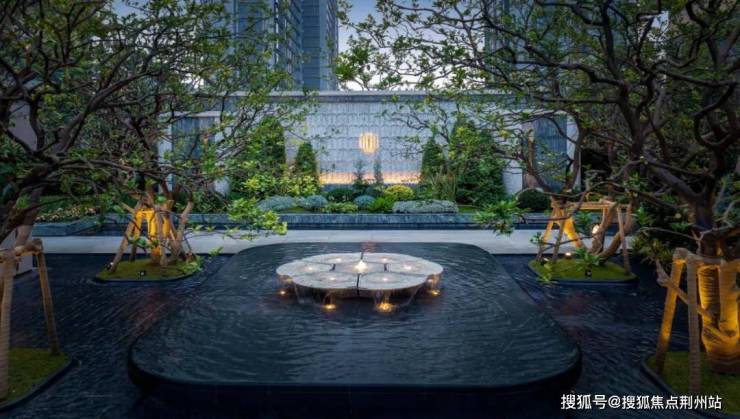 主入口融合多种奢华石材,景墙搭配金属格栅,两侧水景底部铺设黑色奢石,并点缀进口幻影蓝奢石和白雪公主玉石。门庭两侧铁冬青、丛生朴树对称而列,彰显尊贵礼序。