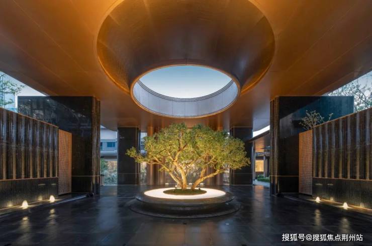 穿过玉石大门,但见透光穹顶之下,石榴树虬枝盘曲,亭亭立于黑色树池之上;圆形天井撷取一捧自然天光,盈盈落于池树之间,与环形玉盘相映成趣。金属镂空格栅背景与两侧安哥拉黑整石雕琢的弧形水景围合出类似内天井的空间,将传统空间叙事与现代审美巧妙融合,形成静谧优雅的光影空间。