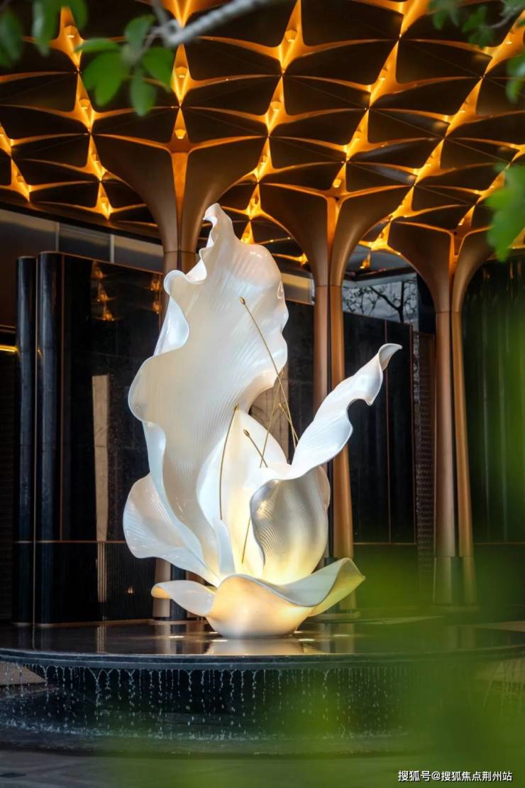 主入口极尽门庭奢礼。全长约42m的超宽门庭,迅速攫住人们的视线。设计提炼百合元素,大尺度雨棚由8根巨型花瓣柱阵列托起,200多片百合花瓣组成的金色吊顶之下百合雕塑熠熠生辉。一扇玉石大门静待开启。