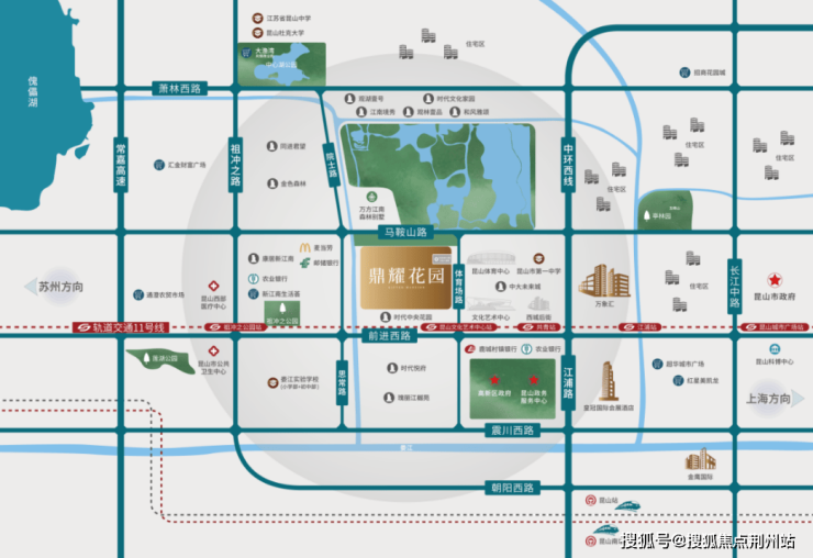 鼎耀花园项目位于昆山城西体育场路马鞍山路交叉口,属于昆山城西核心板块,与昆山体育中心对望,临近西部医疗中心、文化艺术中心,背靠华东地区最大城市森林公园,依托得天独厚的区位优势,凝萃一城“臻”稀资源。