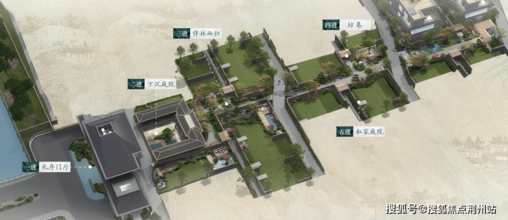 园林景观上,项目将形制构造进行现代转译,借鉴苏州沧浪亭布局意境,并融合宋代名画场景,打造一轴三进园、四进坊巷、五进私家庭院。