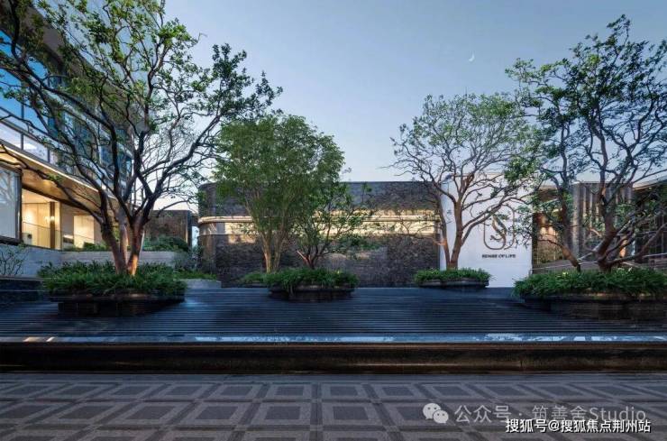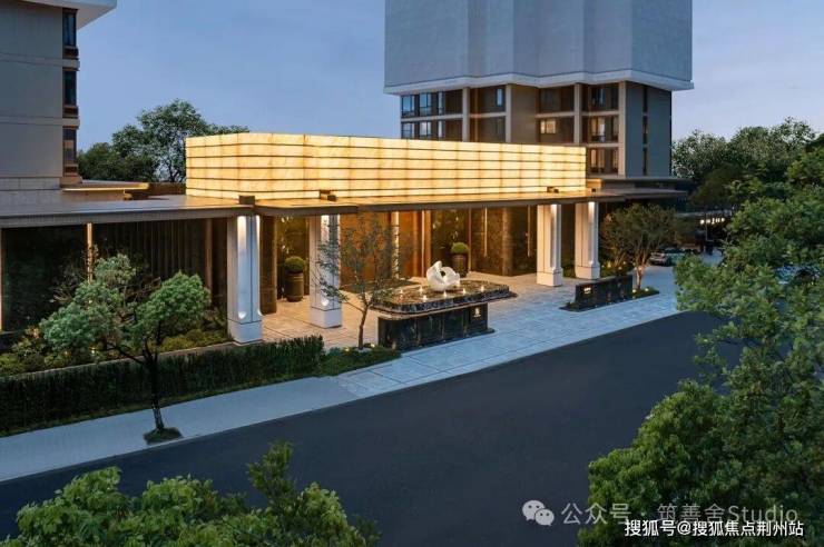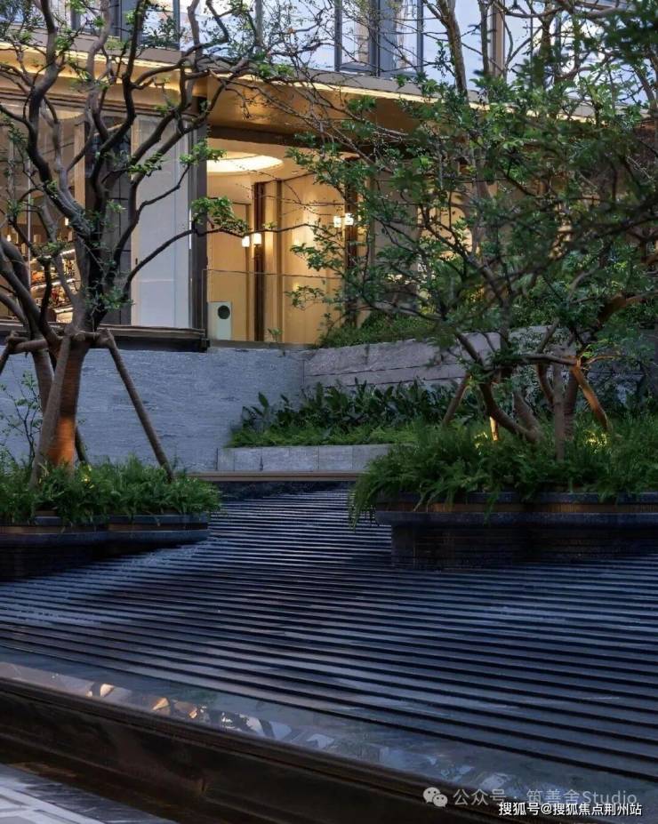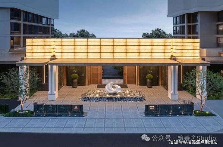 穿过小区大门后,眼前呈现一派绚烂水景,视野豁然开朗:五株婀娜香橼树在花坛中随风轻摆;叠层水幕沿着碧潭金沙、蓝眼睛花岗岩台阶潺潺流淌,营造出宁静祥和的归家心境。