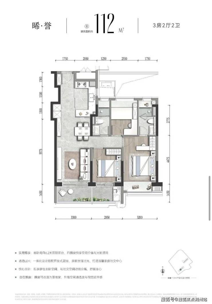:洄游式270°采光大横厅设计,北向飘窗可升级为全落地窗,搭配东面270°景观阳台,形成环幕通透格局。三卧室朝南的“平权采光”设计,匹配二胎或三代同堂家庭需求。北次卧“X空间”可灵活变装书房、儿童房,适配家庭成长周期。主卧配置独立化妆间、南向景观阳台、私卫的套房配置。