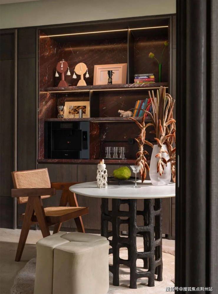 地下会客厅以竹编艺术品《折叠》定调,藤席、大漆、牛骨等天然材质共绘无界雅趣,收藏器皿与刚柔相济的家具共叙东方美学。