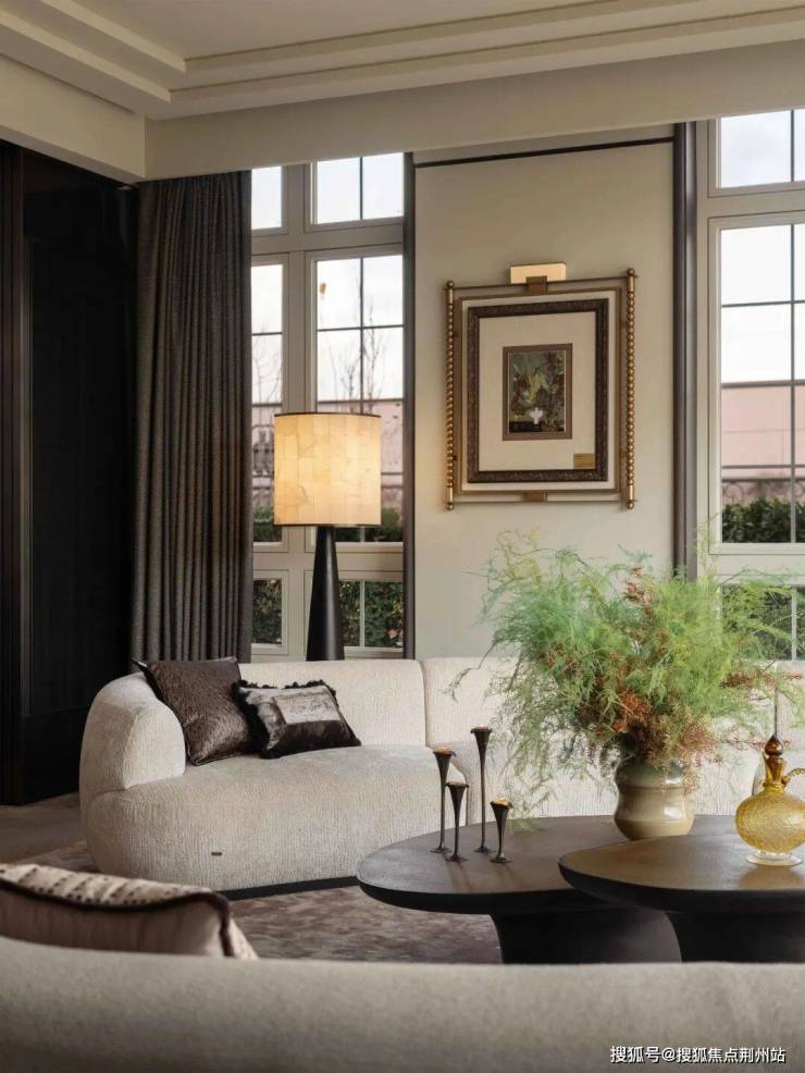 杭州溪径恒庐以“无界”为理念,将庭院四季透过玻璃幕墙融入室内。客厅弧形沙发围合出亲近自然的休憩场域,彭云兢窑变瓷板画《枝影交错的梦》与庭院景致虚实交融。