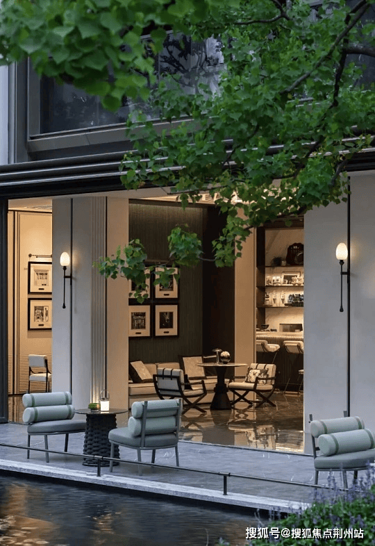 七株精挑细选的红果冬青,生长在层叠的悬浮水院之上。水底的幻彩蓝奢石倒映着天光云影,将杭州的立体山水浓缩进整片园林之中。