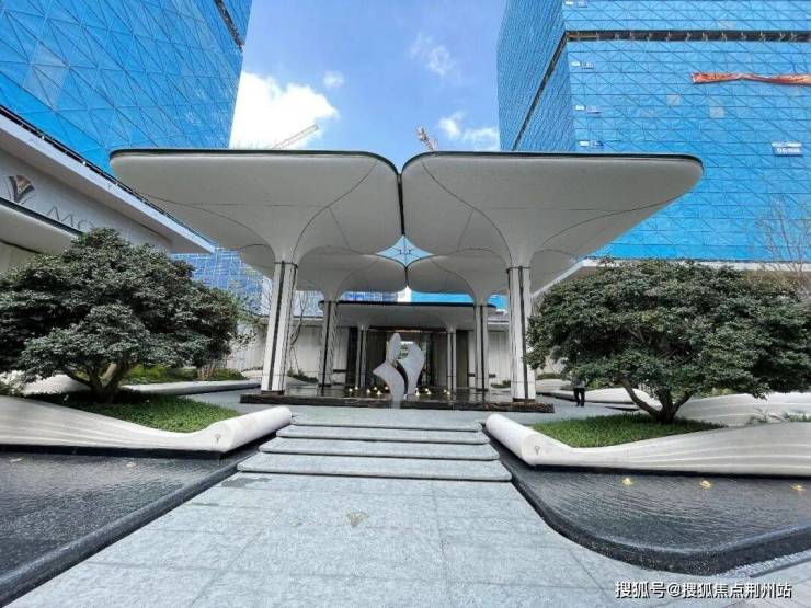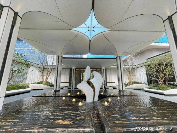 来到蕙澜月华,首先映入眼帘的是一个巨大的「玉树门庭」,主入口处定植了两棵高4米、冠幅4.5米,价值百万约200年树龄的进口日本茶梅,树型十分优美。同时,入口处采用了最长达13米的贝金米黄天然石材,并融入蕙兰花的优美造型,凸显雅舍气质。