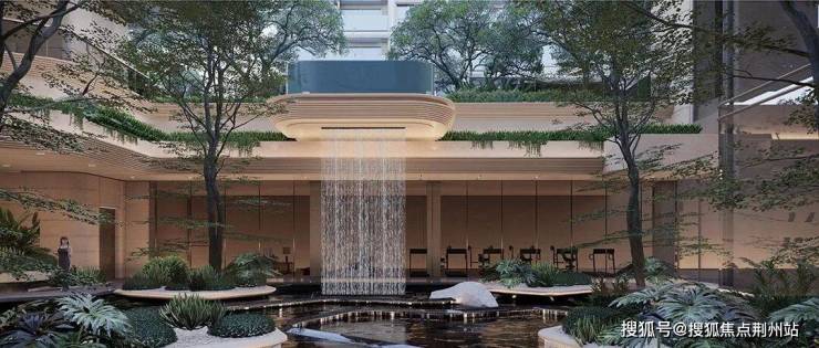 “漂浮的绿洲”,九重层次下沉庭院,区域悬浮泳池+4.3米飞瀑设计,塑造极致度假感受,丰富的视觉奇观。