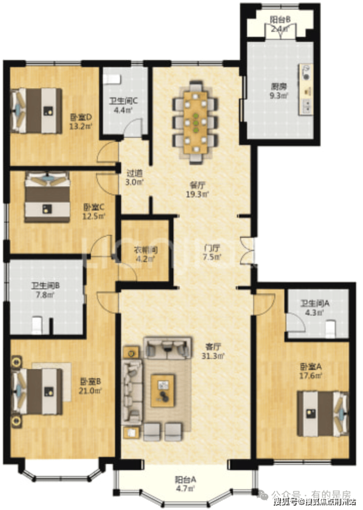 北区都是大户型,有少量141平的三居,主力户型是148-178平的三居,主打188平和215平的四居。188平的四居户型不错,而且能做四居,所以单价更高一些。