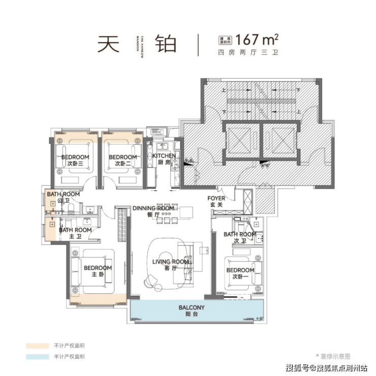 以此次交付的5号楼建面约167㎡户型为例,其空间设计逻辑遵循了从外部喧嚣到内部宁静的平稳过渡。