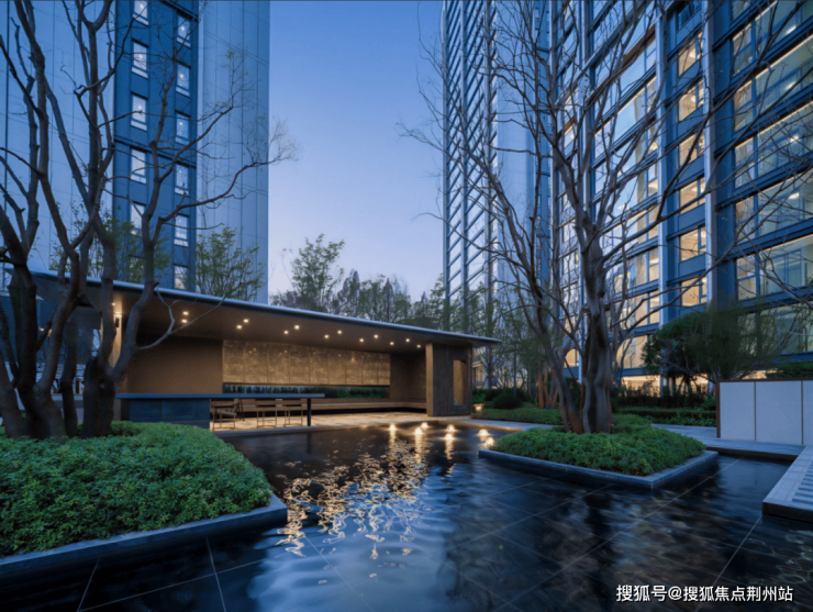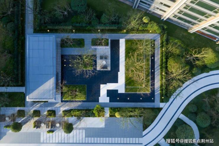 在“水岸画廊”组团,灰白格纹铺装与镜面水台相互错落,金属线条景墙在自然光下呈现出细腻的材质美感。