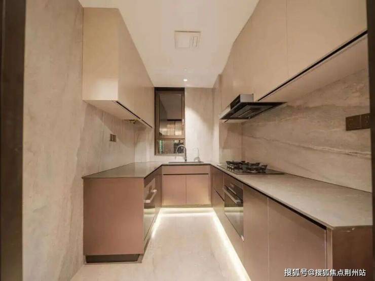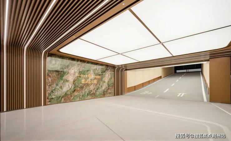 地下车库入口,有别于传统地库入口的功能性导向,这里采用了软膜灯光顶与星空顶的组合设计,配合亚马逊绿岩板墙面,在暖色调灯光的映衬下,呈现出一种展厅般的视觉效果。