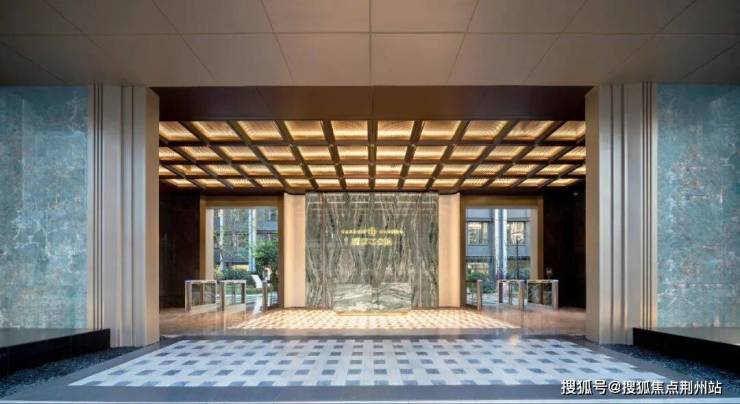 地面的浅色石材拼花与墙面绿色大理石的自然纹理衔接,几何格栅式的铝板吊顶通过嵌入式光源,提升了空间的整体通透感。