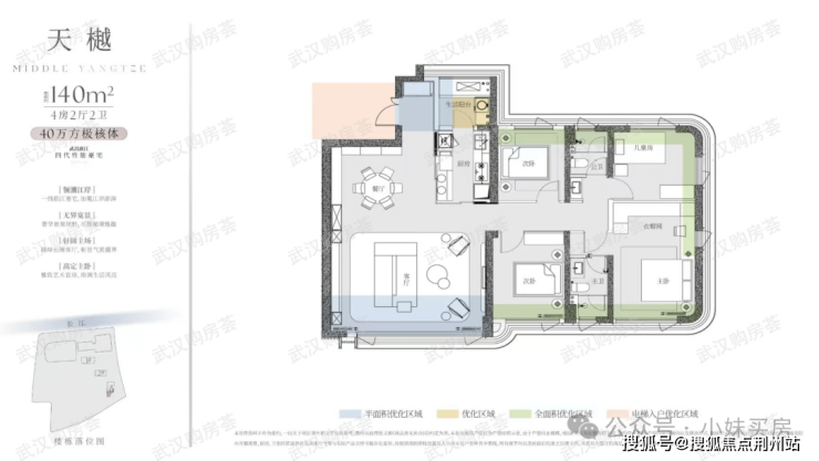 看江视野次之的2号楼总高44层,两梯两户,主打180平户型;