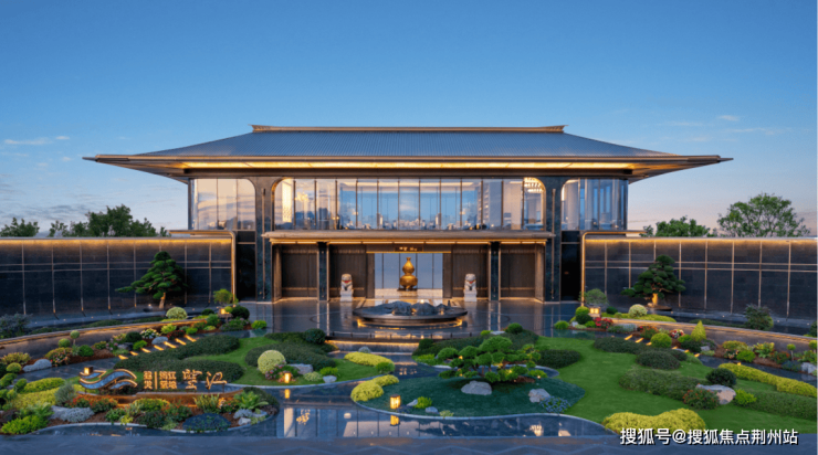 恢弘府门立于瓯江畔,东方展翼飞檐取意《十二水图》“层波叠浪”,苍松迎客照壁浮光映门庭盛景,为归家铺就尊崇仪式感。