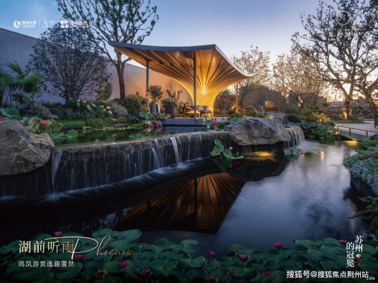 由绿城御用设计师GTS蓝颂总经理宋淑华亲自操刀的景观设计,整体布局以“引水入园、理水造园、湖水活园”为理念,打造“潮鸣八境”,其中最具代表性的,莫过于溯源拙政园“四季亭”而建的四季庭·待霜。