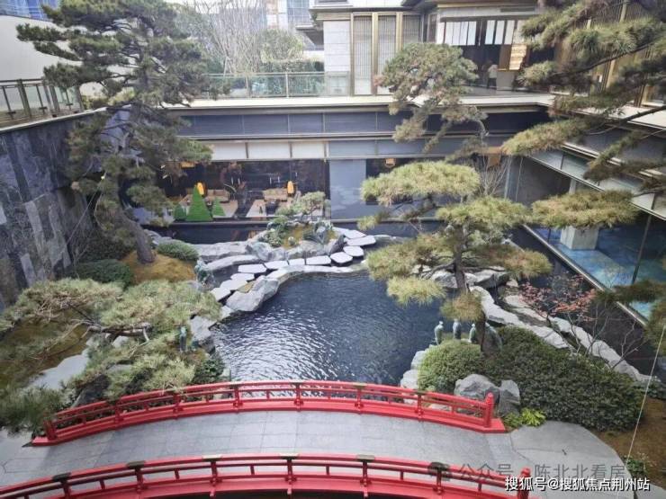 园区造景方面,做了下沉式庭院,庭院是新中式+日式风格,红色廊桥很有记忆点
