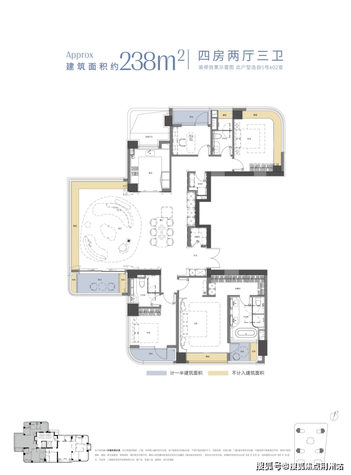 建面约238㎡四房三卫全景舱户型,全屋约46 米全景采光周长,客厅打造连续约 17 米三面采光界面,成就 IMAX 级环幕视野,搭配3.45米奢阔层高,让自然光无死角渗透;朝南双主卧套房搭配全屋六大系统化收纳空间,兼顾家族居住的私密性。