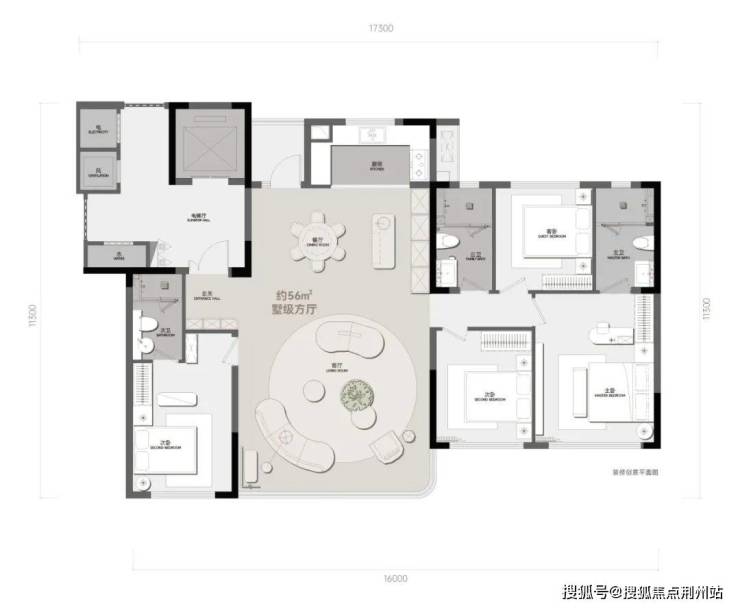 约56㎡的方厅,实际套内约155.9㎡