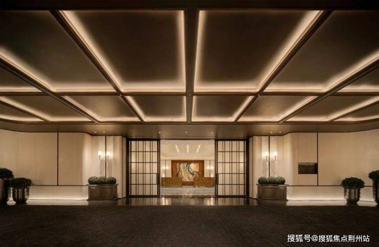 步入门庭,云石吊顶之下,借鉴中国古代建筑中的“藻井”做法,由522片皇家白玉石材拼接而成,凝聚光华,辉映时空。华光之下,中心水池承托起艺术雕塑,莹润皎洁,宛若珍宝。立面则采用铂金钻奢石,搭配墨绿荷塘月色奢石、安哥拉黑奢石花钵、以及手工锻造的巨幅铜门,流淌出一抹温润质感。