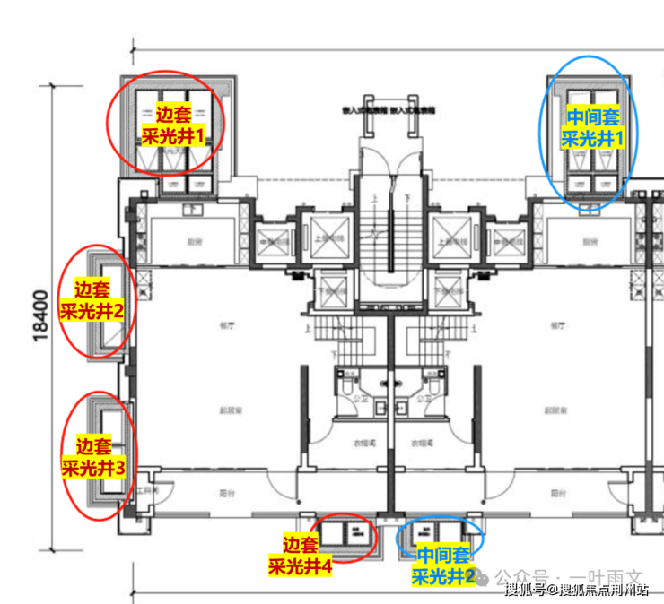 边套户型,有4个采光井,并且北侧采光井做到了大约10㎡(最大进深大约4米,最小进深约3.2米,面宽大约3米),这个尺度几乎超越了苏州所有项目。