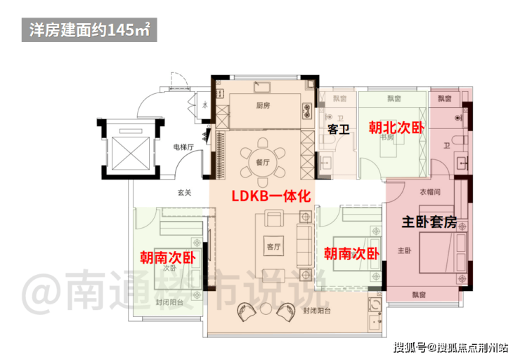 再来看曝光的洋房建面约145㎡3+1灵动户型,一梯两户配置,布局合理,空间利用率高,是南通人钟爱的南北通透,四开间朝南布局。