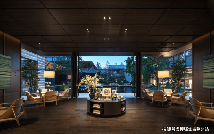 【心流盒子】:整个茶室空间由木材质进行包裹,天花木格栅造型延伸至墙面,打造出立于庭院旁的独特“木质盒子”。推开茶室折叠门,中心庭院的景观一览无余,示范区旖旎风光亦能尽收眼底。