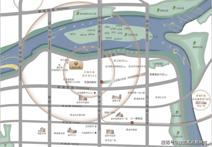 位置:金华市婺城区滨江路与婺州街交汇处,地处江南老城核芯双溪西路片区,北倚金华江生态廊道,东接政务中轴。
