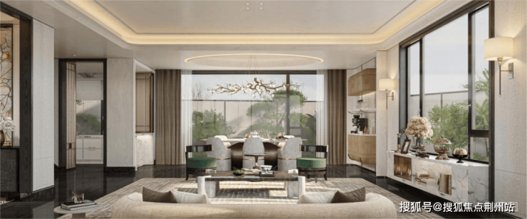 客餐厅、南向次卧、独立主卧层层配享同等尺度面宽,充分将全天日照最大限度地纳入室内。巨幅落地玻璃窗如同取景框,将庭院绿意无缝衔接入内,最大化确保了每位家庭成员都能平等地享有阳光与观景的权利。