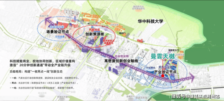 这条发展带是由珞喻路、关东园路、雄楚大道和民族大道的围合区域,自西向东串联起光谷步行街、汽发社区、光谷创业街至关东工业园。