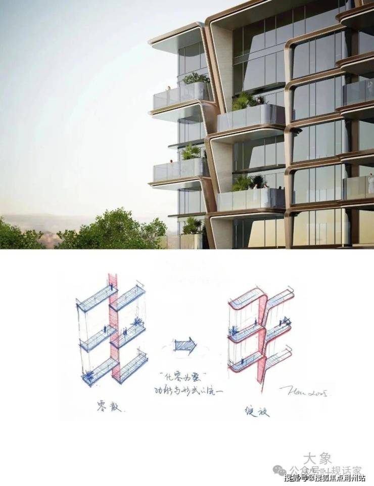 嘉佰道·南京的造型语言,突破了传统居住建筑规整的立面框架。设计以“绽放”作为造型母题,通过高度统一的功能解题与形式创新,整合了传统四代住宅难以解决的隐私保护与视线平权的难题,将水平露台与竖向视线管理构件,通过花瓣绽放的生长意向进行整合统一,构建了独一无二的视觉辨识力。