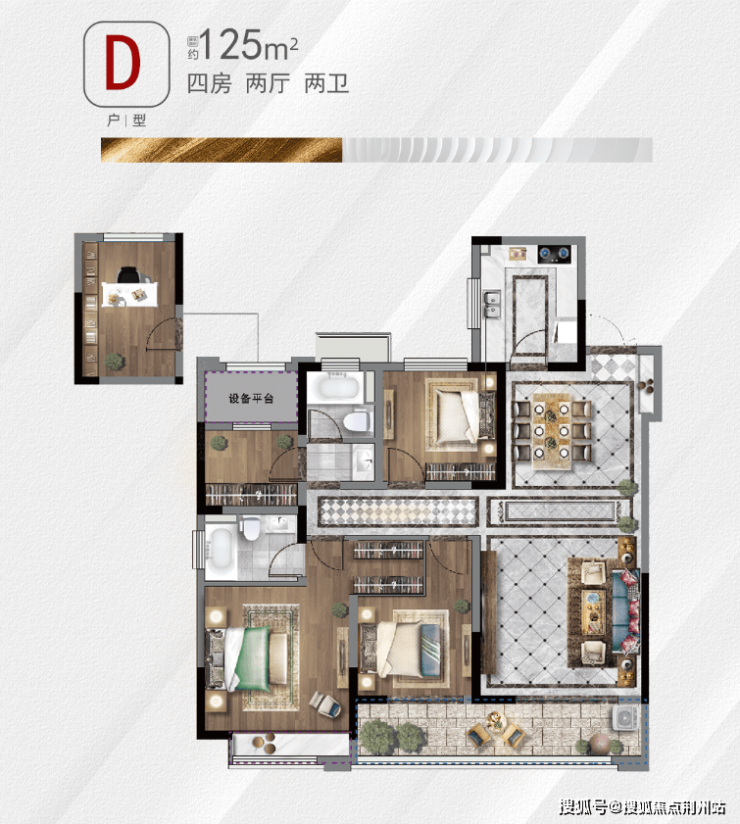 ↓↓建面约125㎡四室两厅两卫:三开间朝南,特大面宽+双开间阳台,采光性和通透性都很赞。