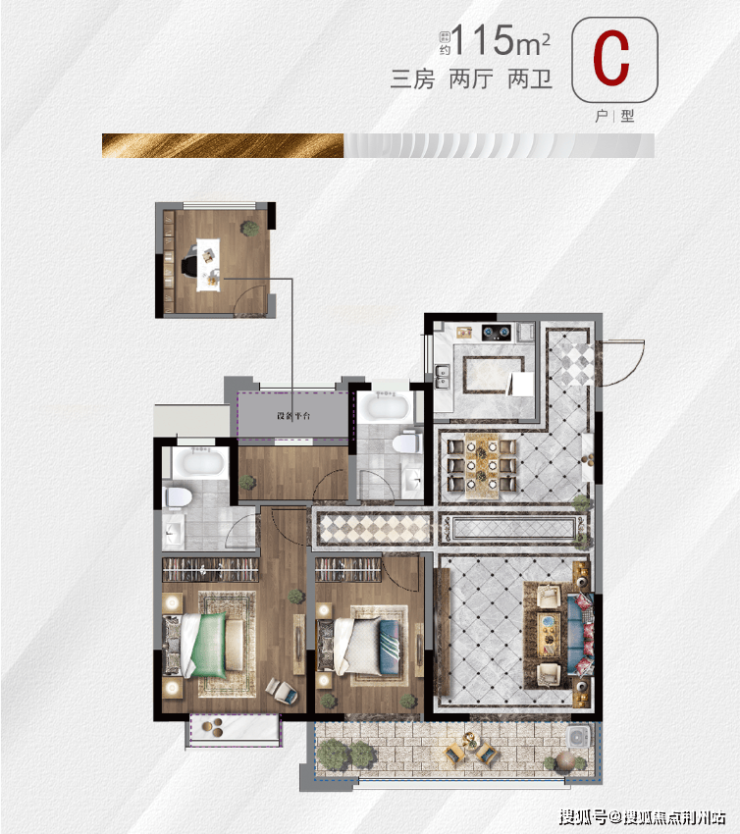 ↓↓建面约115㎡三室两厅两卫:三开间朝南,户型方正,15㎡主卧套房设计,衣帽空间+独立洗手间+景观飘窗,生活仪式感满满。
