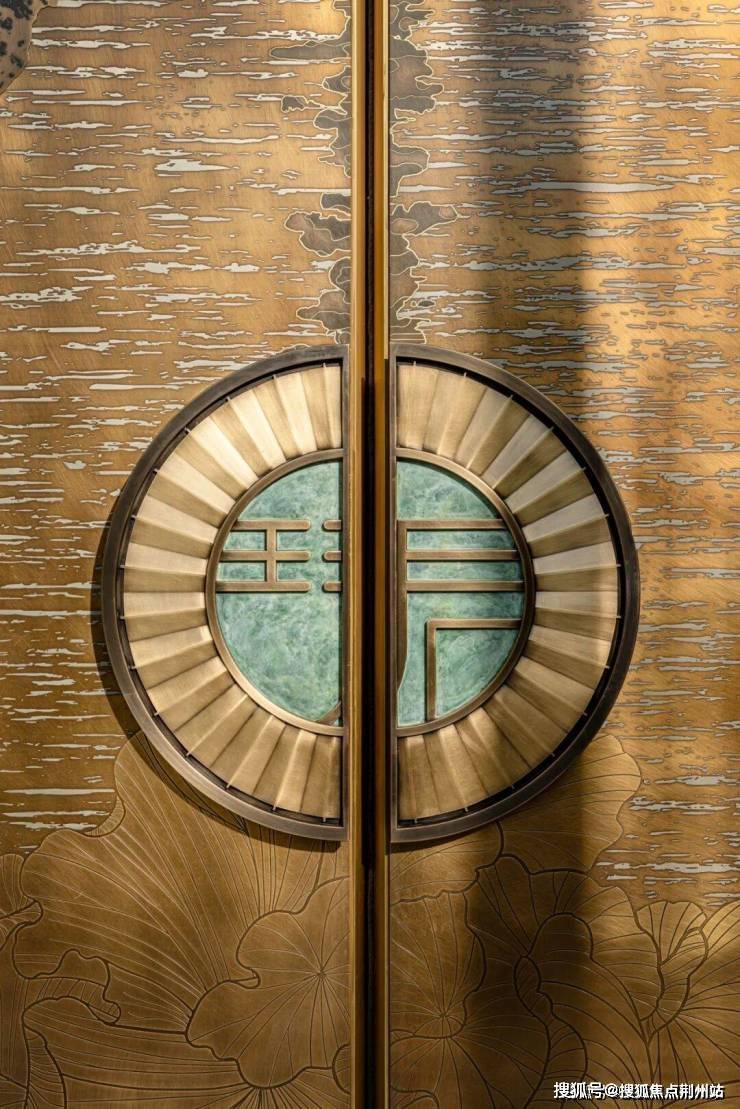 金潮启阖·文脉风骨:让门第镌刻江南千年文脉。一扇高约10米的巍峨铜门屹立,尽显庄重典雅。这扇黄铜大门名为“金潮启阖”,由铜雕大师朱炳仁的团队手工锻造,上面雕琢了钱塘江千年潮汐冲刷的印记,暗合天地开阖之象,又仿佛“楼观沧海日,门对浙江潮”的盛唐气象再现。大门旁边的六面屏风玉柱,以及顶上一柄徐徐展开的折扇图腾,也均是江南文脉的重要符号,更是门第气度的象征。