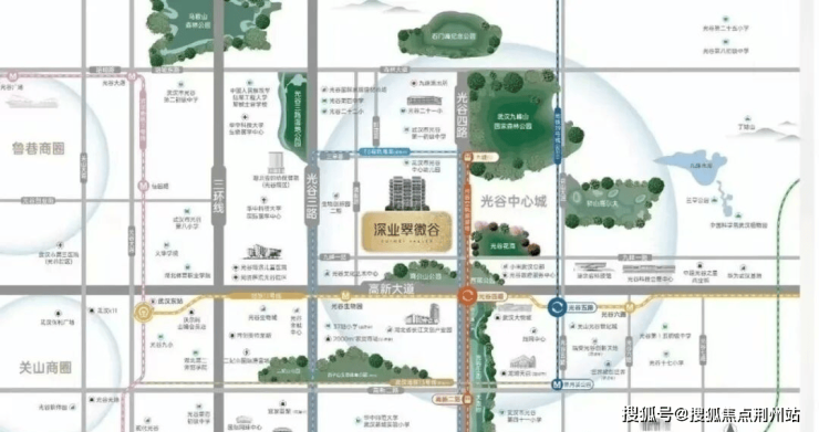 地理位置:光谷中心城核心区域,紧邻高新大道、地铁11号线光谷四路站(约400米),周边被鸡公山公园、西苑公园等5大公园环绕。