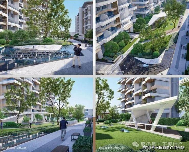 景观设计融合"江洲山林"意境,以两轴一心四园格局打造度假式园林,重新定义滨江生活美学。