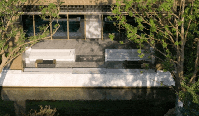 【碧谷幽澜】下层会所围合的中庭打造一座虽为人造宛若天开的东方自然花园如同一处幽谷碧潭,其中小桥流水叠石飞瀑相映成趣自然成画,既成四周室内的观景,同时又在庭院中设置小径可以步入游赏,结合围廊与室内功能空间设置亲水平台与卡座,达到动静兼宜的花园体验。