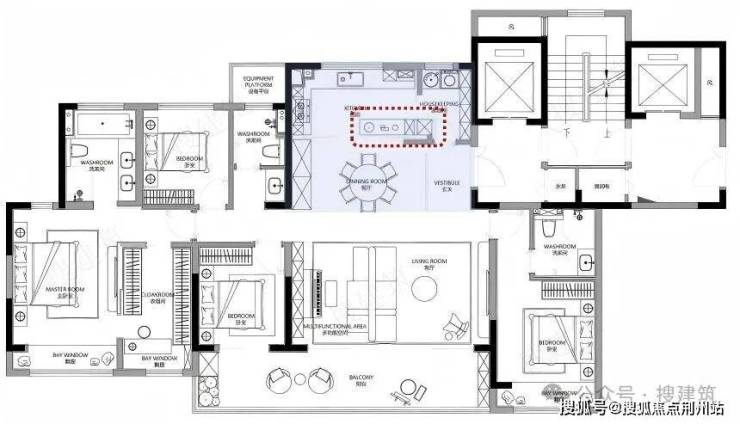 但实际落地时会发现,如果厨房操作台不面向餐厅的话,其实互动性是比较弱的。所以很多房企开始在户型厨房上都设计了 西厨岛台。