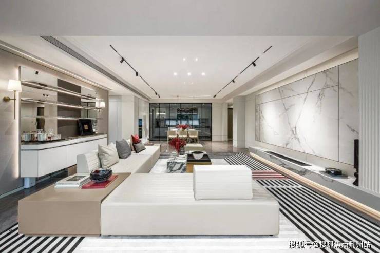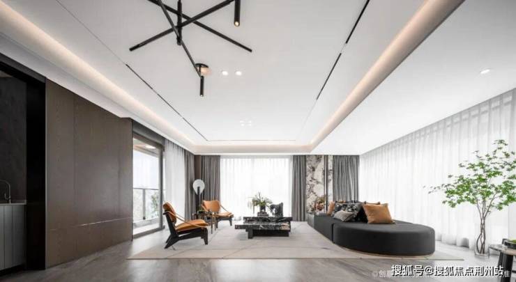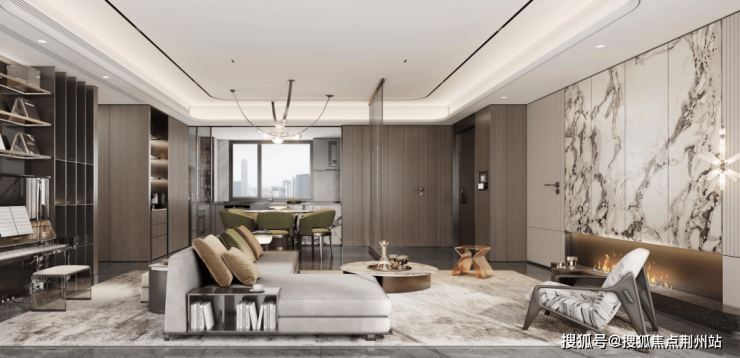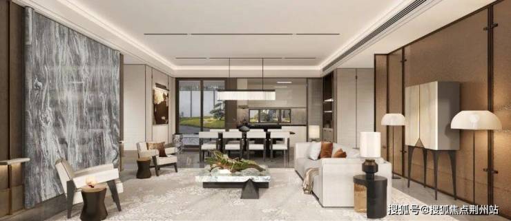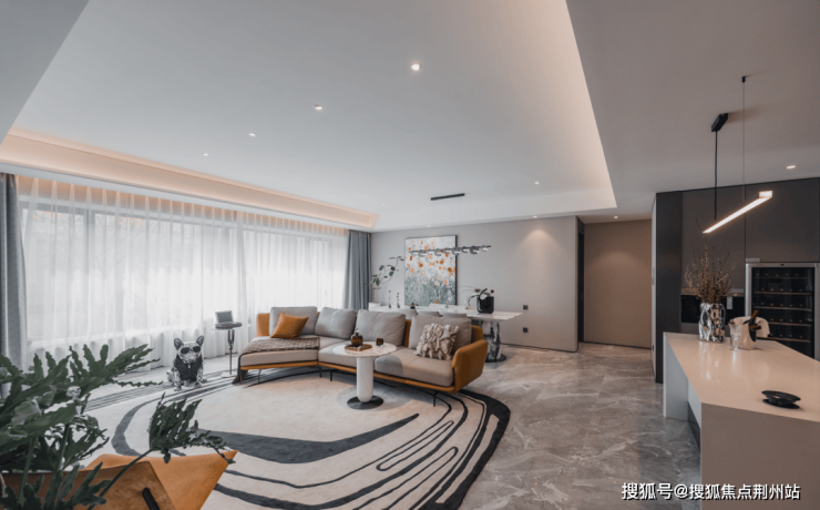 “第三厅”的设计结合约7.1米开间餐客厅,家庭公共空间的尺度感便被无限延伸,让家人在不同家庭区域各得其乐。