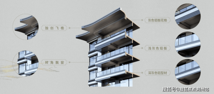 外立面采用三段式设计,顶部采用建发独创飞檐,中部融合大面铝板,高层采用三玻两腔low-e玻璃,底部单元入户部分配干挂石材,构筑新中式标识感,让现代和传统完美交融。