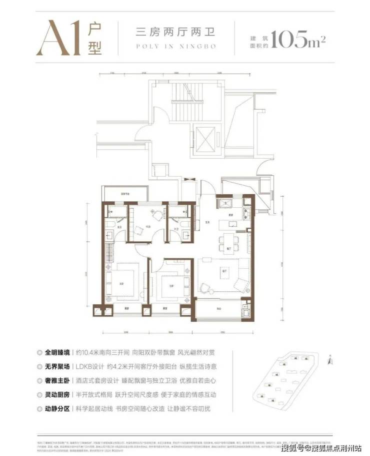 主推户型:建筑面积约105㎡户型,三房两厅两卫格局,约10.4米南向三开间,半开放式厨房设计,让生活更自由、惬意。