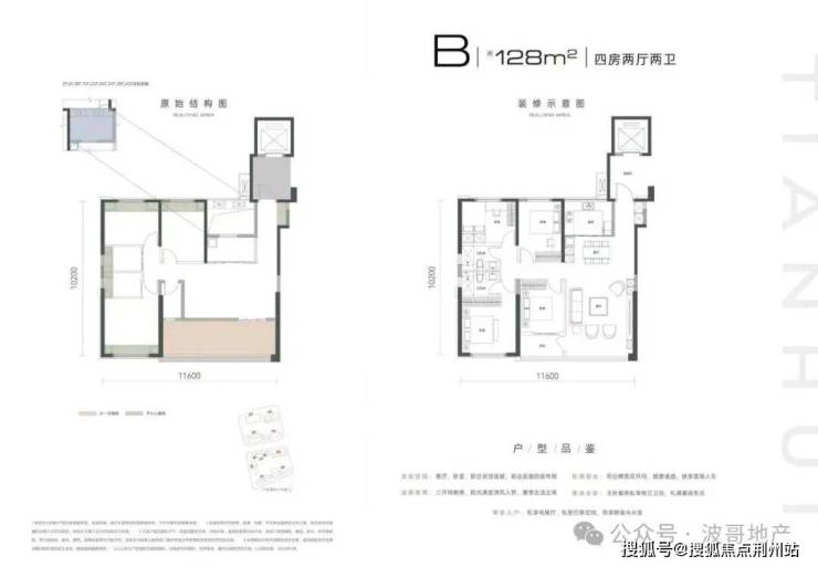 B128㎡四室两厅两卫:此户型分布在3/6/7号楼东西两端边户户型,超高层户型三梯四户布局,每一户均有独立电梯前室,三开间朝南,动静分区设计;整体户型开间(宽)约11.6米、进深约10.2米;入户玄关处拥有飘窗可拓展空间,还让玄关自然采光通风更佳,厨房超大采光窗更显明亮;阳台、飘窗、电梯前室、设备平台拓展等,整体户型得房率约在98%-100%(楼栋不同略有差异)。