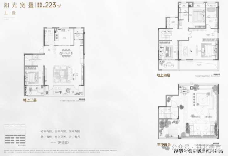 建面约223㎡上叠,墅厅+空中花园,三楼露台挑空设计相当于一整层为赠送空间,室内3.3米层高;