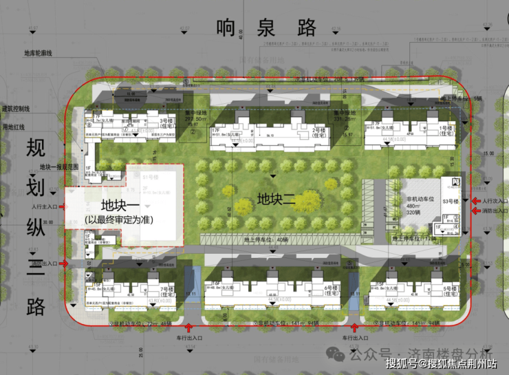 项目为双大门设计,除了只走行人的西侧的主大门之外,东大门为人行+车行,南侧有两个车行出入口